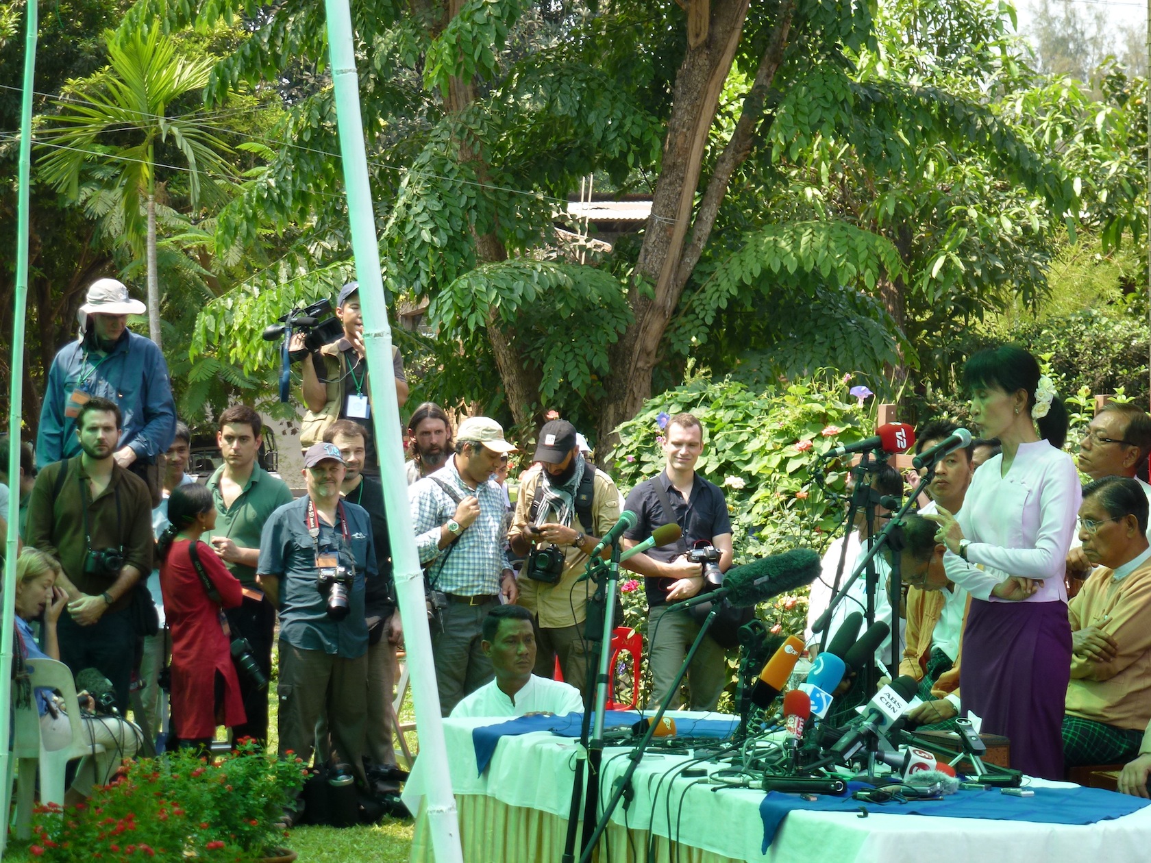 De første minutter af Aung San Suu Kyis møde med et par hundrede internationale mediefolk i haven uden for privatboligen på University Avenue i Yangon går med at løse tekniske problemer. Nogle af demokratiikonets velkomstord forsvinder i et skingert elektrisk hyl, og hendes hjælpere må have råd og vejledning fra besøgende tv-folk for at få lyden til at fungere.