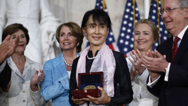 ‘ The Lady’ har i taler og interview berørt et af de mest følsomme emner i sit lands demokratiseringsforsøg: USA’s engagement i det tidligere så lukkede land. »Jeg foretrækker at se Burma som et område, hvor Kina og USA kan styrke forståelsen af hinanden () jeg ønsker udenlandske investeringer i Burma, men på den ordentlige måde. Jeg siger ikke: Kom og sæt jeres penge i Burma. Jeg siger: Kom med jeres investeringer, men på den rigtige måde«. Langvarig isolation, påtvunget af et xenofobisk militærstyre gennem et halvt århundrede, har gjort Myanmar til et af Østasiens fattigste lande. Potentialet for et kraftigt økonomisk løft er til stede, og skal dette lykkes, må landet holde døren åben for landets største investor, Kina.