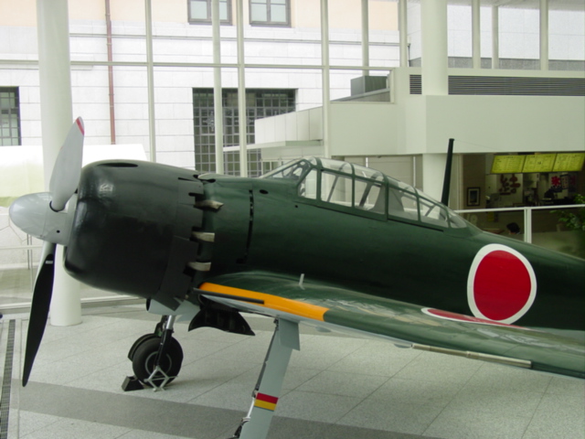 VI TRÆDER indenfor i Yushukan og køber billetter. Der er i forhallen to udstillingsobjekter: det mest anvendte japanske jagerfly fra dengang (Mitsubishi Zero) og et gammelt damplokomotiv, der var i anvendelse på den dødens jernbane, som det japanske militær ved brug af lokal arbejdskraft og overvejende britiske krigsfanger lod opføre mellem Thailand og Burma i 1942-43.