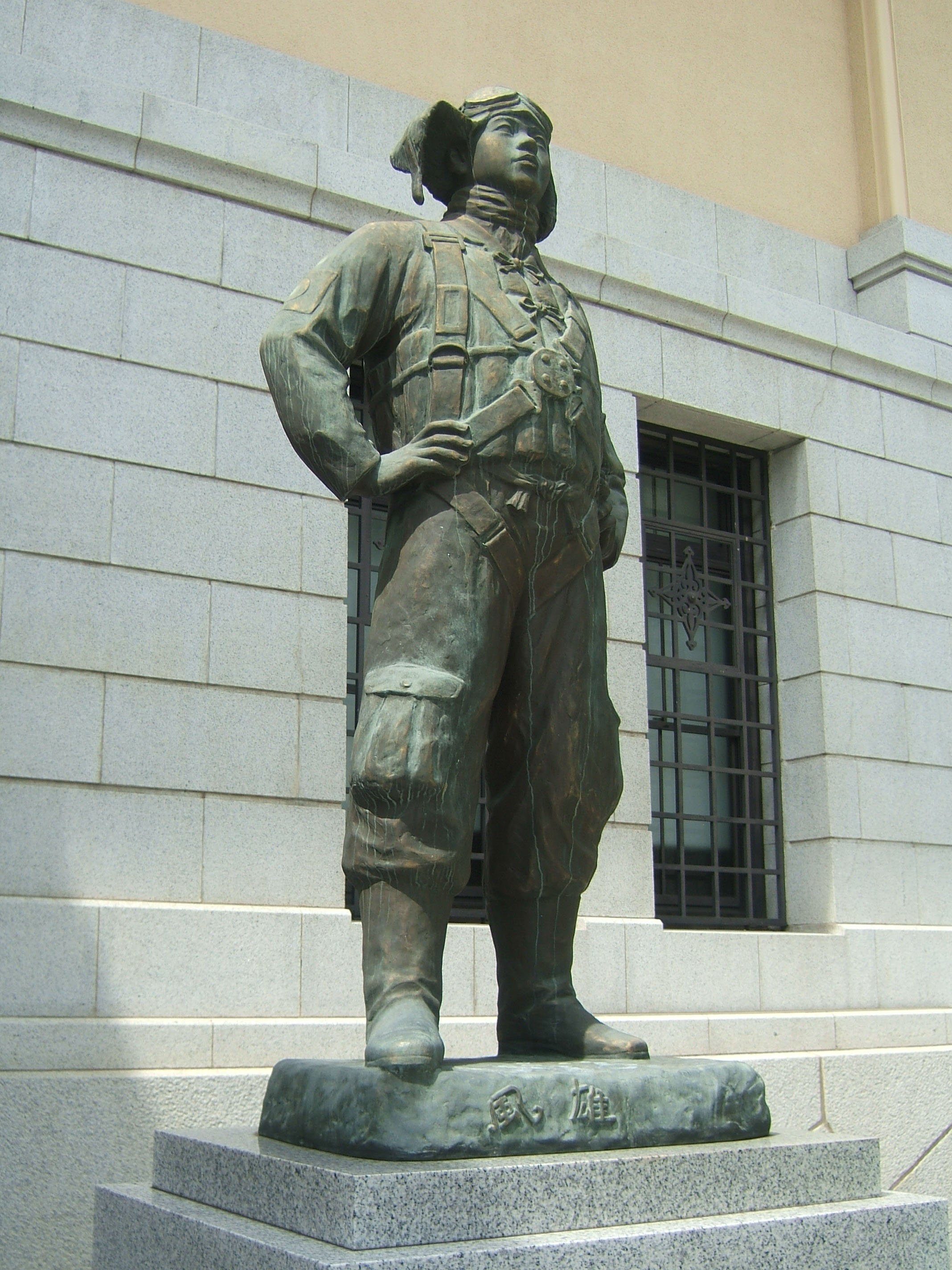LETTEDE OG en smule forvirrede forlader vi Yasukuni-komplekset og bevæger os over i nabobygningen, krigsmuseet, der hedder Yushukan.Tæt på indgangen står en statue af en kamikazepilot.