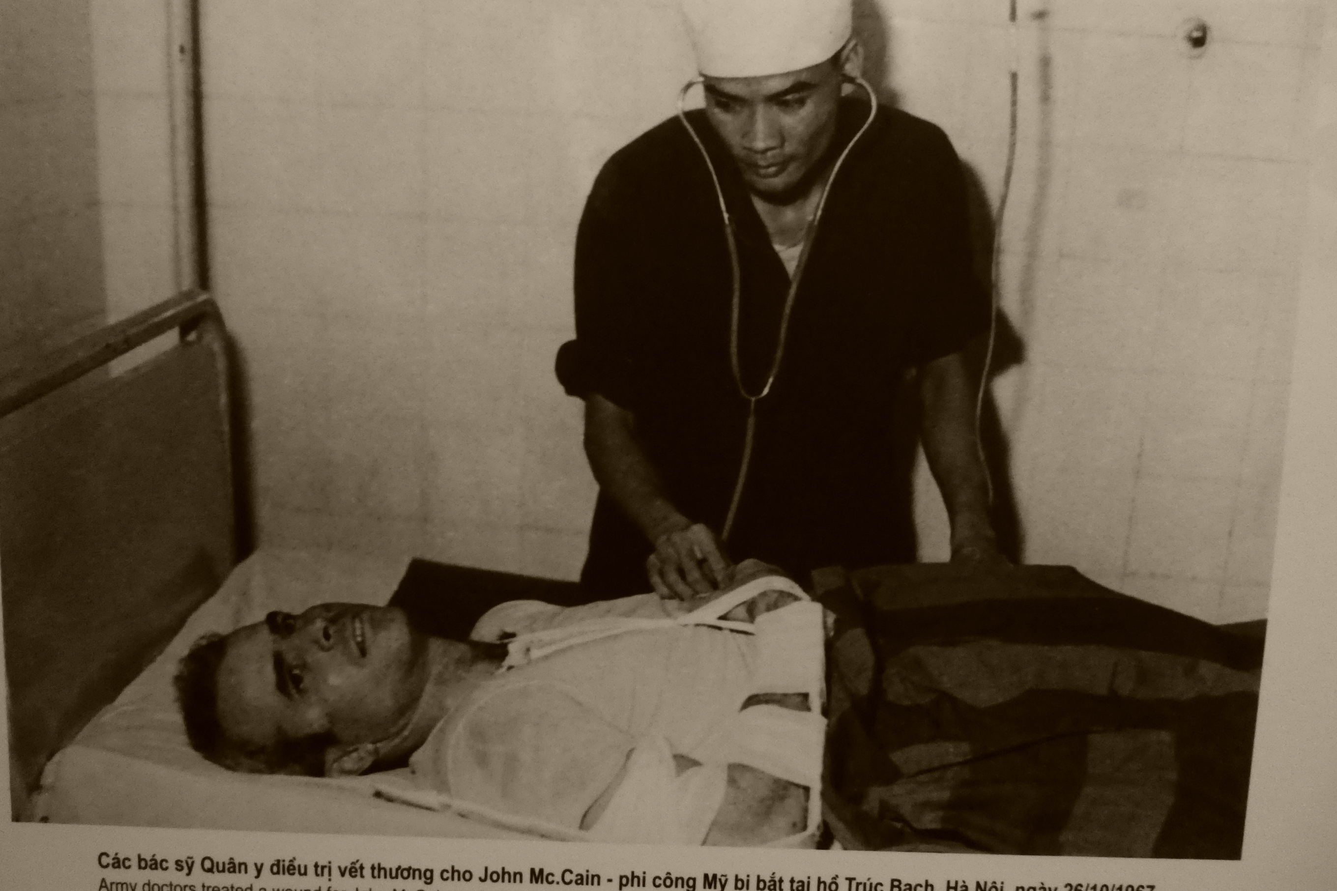 Den 31-årige pilot blev reddet af sin faldskærm og landede i Hanois Truc Bach-sø, hvor han blev fisket op af lokale. Et foto i en af museets glasmontrer har foreviget dette øjeblik. Et andet foto viser McCain i en hospitalsseng, hvor han tilses af en læge.