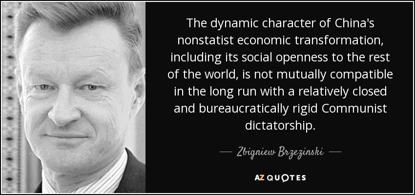 I et interview med Nathan Gardels i WorldPost fra december i fjor bliver Brzezinski mindet om, at han var den egentlige arkitekt bag den normalisering af de diplomatiske relationer mellem USA og Kina, der trådte i kraft januar 1979. Her formulerer han den langsigtede interesse i USA’s Kina-politik således: »En verden, hvor Amerika og Kina samarbejder, er en verden, hvor Amerikas indflydelse maksimeres (…). Det er ikke i vores interesse at få et antagonistisk forhold til Beijing. Det er langt bedre for amerikanske interesser, at vi samarbejder tæt med kineserne, for dermed tvinges russerne til at følge efter, medmindre de vil risikere at blive efterladt i kulden«.