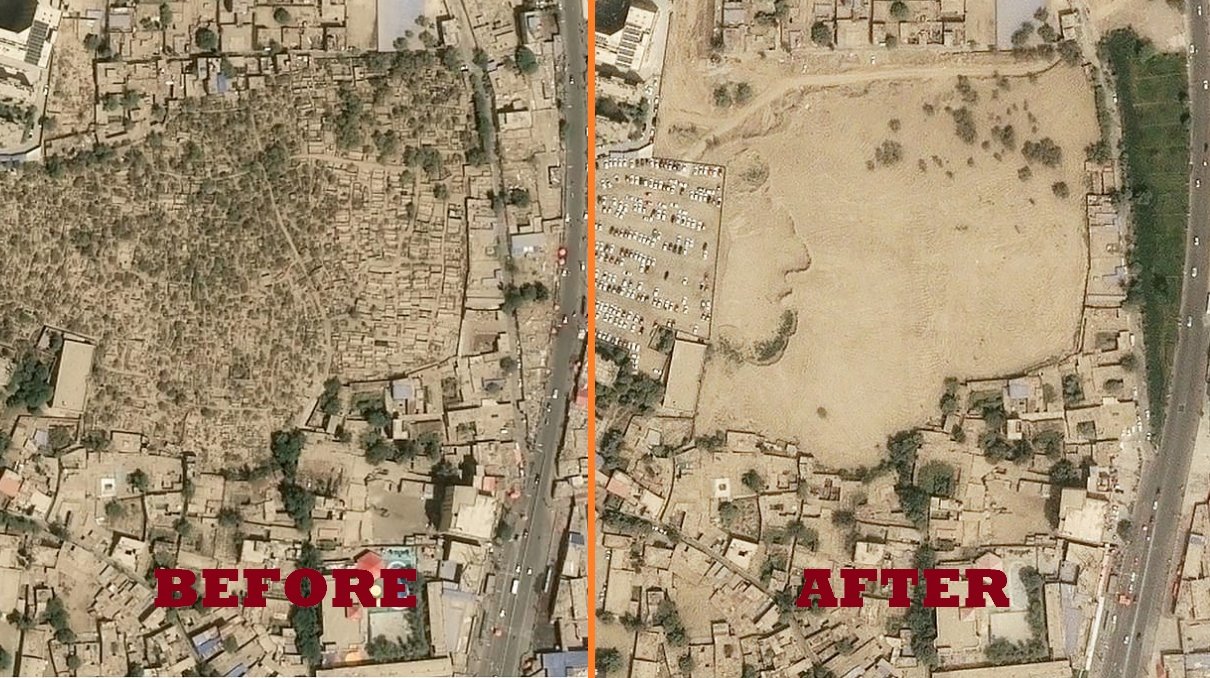 Organisationen Earthrise Alliance, der specialiserer sig i at analysere satellitfotos, har dokumenteret, at snesevis af begravelsessteder i Xinjiang er blevet forvandlet til ruindynger. Den officielle forklaring på rydningerne er, at gravsteder skal ’standardiseres’. For uighurerne er dette indlysende et indgreb, der skal skabe frygt og udradere deres familieidentitet.