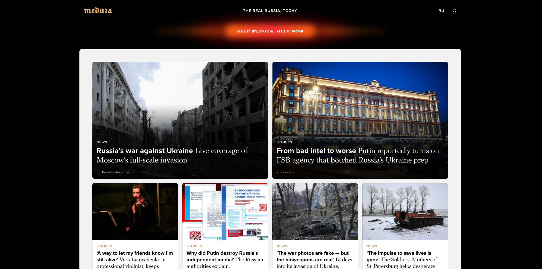Meduza har for nylig rapporteret om, hvordan der på statslige russiske radio- og tv-kanaler foregår en regulær kamp om at indhente oplysninger om krigen i Ukraine fra udenlandske og eksterne private medier, og at deres journalistkolleger hyppigt forsøger at omskrive begivenhederne, så de undgår ordet krig, men alligevel ikke lader lyttere og seere i tvivl om brutaliteten i, hvad der foregår.